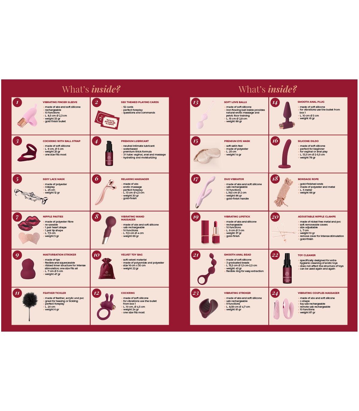 La elegante caja de regalo no solo sirve como obsequio, sino como una invitación a disfrutar de la intimidad y el deseo. Ya sea para consentirte, sorprender a tu pareja o alegrar a un amigo, este atractivo calendario es la manera ideal de enriquecer tus experiencias sensuales.